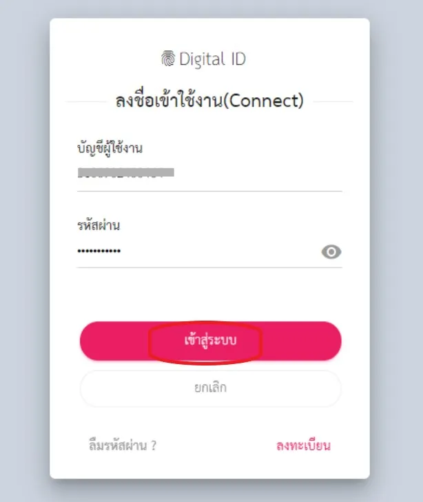 ใส่ “ชื่อบัญชีผู้ใช้งาน(Username) และรหัสผ่าน(Password)” ของระบบ Digital ID และคลิก”
