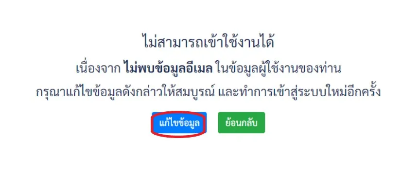 กรณียังไม่เคยยืนยันอีเมลระบบจะแจ้งให้ยืนยันอีเมลก่อน จึงจะสามารถใช้งานระบบได้ โดยคลิก”แก้ไขข้อมูล”
