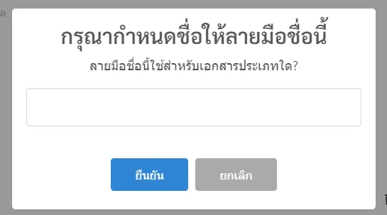 - หากต้องการใช้ลายมือชื่อนี้คลิกปุ่ม “ยืนยัน” ให้กำหนดชื่อลายมือชื่อนี้ว่าใช้กับเอกสารประเภทใด (กรณีผู้ใช้ลงลายมือชื่อในเอกสารแต่ละประเภทแตกต่างกัน)