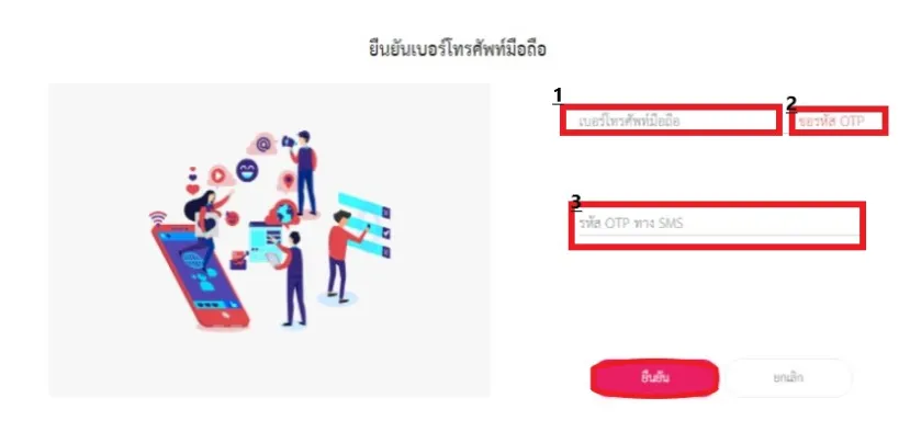 3.2 ทำการยืนยันเบอร์โทรศัพท์มือถือ :โดยคลิก “ยืนยันเบอร์โทรศัพท์มือถือ” และกรอกข้อมูลตามขั้นตอนดังนี้
