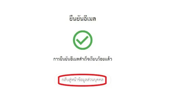 เมื่อใส่ OTP ที่ได้รับทางอีเมลแล้ว ระบบจะแจ้ง “การยืนยันอีเมลสำเร็จเรียบร้อยแล้ว คลิก “กลับสู่หน้าจอหลัก”