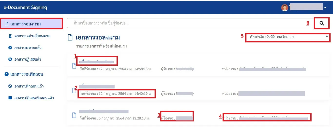 เมื่อได้รับอีเมลแจ้งการลงนามหรือเข้าใช้งานผ่าน URL : sign.egov.go.th และ Login ด้วย Digital ID เรียบร้อยแล้ว ระบบจะแสดงข้อมูลเอกสารที่รอลงนาม ประกอบด้วย